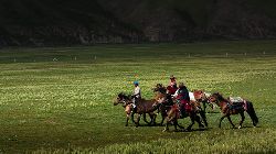 8月的扎溪卡草原水草豐美、牛羊遍地、到處是一片花的海洋,兩萬多平方公里的廣袤大地如同一座敞開的大花園。汽車行駛在草原上,就像一只小船在無邊無際的大海上航行,有時候覺得已走到了天邊,可是登高一望,還是芳草碧連天,地平線依然很遙遠,好像永遠沒有盡頭。在這離藍天很近離塵世很遠的廣闊空間里,仿佛在夢游仙境,周圍的山川景物都帶有夢幻般的色彩,對自身的存在也產生一種不真實的虛幻感。在這里,你似乎已變成了一個自由自在的牧人,只不過你放牧的不是牛羊,而是生命和靈魂。 扎溪卡草原的夏天到處呈現(xiàn)出一派生機勃勃的盎然景象,所有的生命之花都在這個季節(jié)盡情地綻放、茁壯地成長。在這個被稱為動物天堂的地方,你仿佛走進了一個天然野生動物園,所到之處,不時有“羽族炫翎,蹄類競走”的情形出現(xiàn)在身旁。你會驚喜地看到一對對黑頸鶴在水邊起舞,一群群白唇鹿在山間奔跑,敏捷的巖羊在峭壁上跳躍,矯健的金雕在藍天上翱翔……
