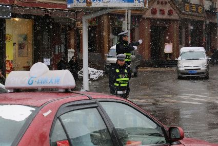 在將軍橋,為方便車(chē)輛順利通行,三名交警們一大早就上崗了。雖然雪仍然下著,但交警站在指揮臺(tái)上,認(rèn)真指揮著過(guò)往車(chē)輛。
