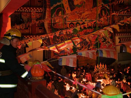 康定的幾座黃教寺廟舉行了法會,擺酥油花,燃元根燈供佛。信教群眾除在家供燈外,有的還登跑馬山,赴南無寺敬燈油。入夜后又成群結(jié)隊涌向康定城中的安覺寺,參加元根燈會,以此紀(jì)念藏傳佛教格魯派創(chuàng)始人、宗喀巴大師圓寂成佛。安覺寺里人潮涌動,熱鬧非凡。有扶老攜幼的信教群眾,有祈求平安的生意人,也有慕名而來的外地攝影師。燈會這天,最忙碌的除了寺廟里的喇嘛,就數(shù)在寺廟周圍站崗的消防員了,消防員李剛說:“一大早就有遠(yuǎn)道而來的信教群眾和僧尼到寺廟里點(diǎn)燈了,為了保障寺廟的消防安全,我們已經(jīng)在這飄著雪花的冬日里站了整整一天了,要等到每一盞燈都安全的燃盡,我們才可收隊離開。”
