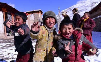 7、甘孜縣城郊雪山下的也哈村。雪后初睛,村里的孩子們?cè)诖逯械膹V場(chǎng)上嬉戲。