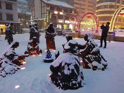 “風雨送春歸,飛雪迎春到。已是懸崖百丈冰,猶有花枝俏?!?月4日傍晚,大片大片的雪花,從昏暗的天空中紛紛揚揚飄落下來。霎時間,山川、河流、城市,全都籠罩在白蒙蒙的大雪之中。黃昏的雪,下得深切切的,好象有千絲萬縷的情緒似的,又像海水一般洶涌,能夠淹沒一切,還有一絲揭開藏頭露尾般的裸露感。雪花形態(tài)萬千、晶瑩透亮,好象出征的戰(zhàn)士,披著銀色的盔甲,又像是一片片白色的戰(zhàn)帆在遠航…… 落光了葉子的柳樹上,掛滿了毛茸茸、亮晶晶的銀條兒;冬夏常青的松樹和柏樹,堆滿了蓬松松、沉甸甸的雪球。那一片雪花在空中舞動著各種姿勢,或飛翔,或盤旋,或直直地快速墜落,鋪落在地上?!昂鋈缫灰勾猴L來,千樹萬樹梨花開”——這是雪的燦爛;一場瑞雪,扮美了康定,年味籠罩的康定城,嫵媚妖嬈。無論是背水姑娘、有著年味兒的將軍橋,還是大紅燈籠高高掛的康定門,都在雪后別有一番景致。與美景合影、和朋友玩雪都是最佳選擇。在風雪中,交警不畏嚴寒默默堅守崗位 ,指揮交通疏堵保暢。他們的身影在皚皚風雪路上站成一道道最美的風景,溫暖了康定。從早上六點開始,康定的環(huán)衛(wèi)工就迎著刺骨的寒風,開始了除冰雪保通暢的行動,在積雪覆蓋的康定城,早起的商販樂呵呵地做起了買賣;民工迎著雪后的寒風出門務(wù)工,他們是最可敬的人。