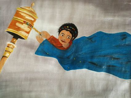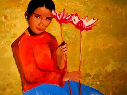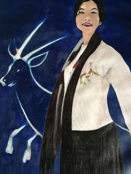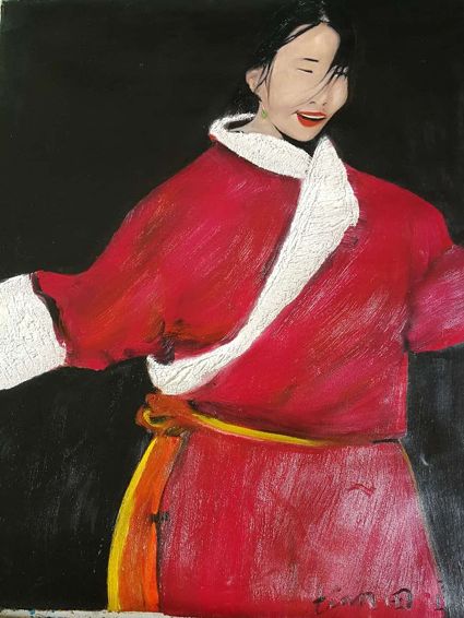 畫畫三年多了。十三歲寫詩;到了高原后,方開始創(chuàng)作長篇小說。在上海,我做過畫廊。但要說斗膽動筆畫幅肖像。我是在白度母唐卡前燃了三炷香的。包括在咖啡店現(xiàn)場作畫。到京城繼而國外辦畫展,我認為都是因了我把畫布當成了詩稿的緣故。于是,大家喜歡我這種野路子,天馬行空,可又不舍方圓的創(chuàng)作手法。接下來,歐洲、東京還會有我的系列展覽。