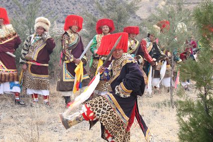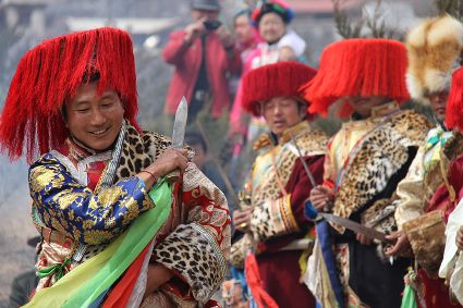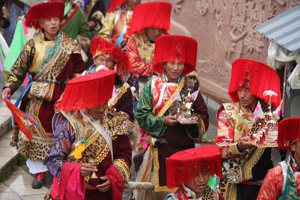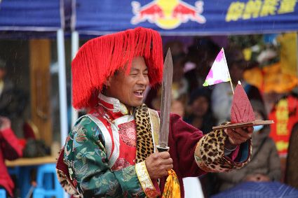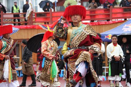 除了歌舞文化,德欽還是民俗文化最大的平臺,神山祭祀是村村寨寨必不可少的活動,在德欽,藏民對山水自然賦予了靈性,認(rèn)為自然也是和人一樣有著生命和靈性,尊重自然演繹出神山祭祀活動豐富多彩?!暗顿潯?藏語稱“百諧”。在德欽農(nóng)村,刀贊是祭祀活動的重頭戲,這一天,不亞于一個盛大的服飾表演。相傳“百諧”是古時村民為消除戰(zhàn)亂,祈福平安的一項傳統(tǒng)祭祀活動,延續(xù)至今已經(jīng)成為一項傳統(tǒng)的民俗活動。“百諧”既是祭祀活動的一個儀式,也是一個獨立的傳統(tǒng)民俗活動,村里每戶一男丁在這一天必須參加“百諧”?!疤K夏”是村里男人戴的最為隆重的帽子,他不同于金邊帽和狐皮帽。長刀是“刀贊”的道具, “吉祥的日子里,我們一敬天地,賜給我們帶來幸福的生活;再敬尊敬的共產(chǎn)黨,為我們帶來平安吉祥;三敬慈祥的雙親,教會我們?nèi)绾巫鲆粋€好人……”朗朗上口的說詞伴著閃閃的刀光起舞,頗具康巴壯士的英武陽剛。