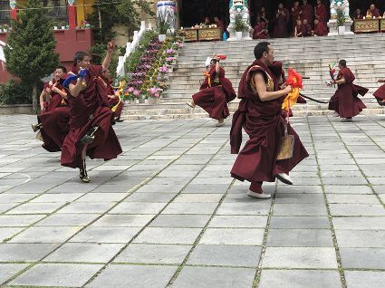 跳神儀式開(kāi)始,南無(wú)寺內(nèi)鼓號(hào)齊鳴,喇嘛身著顯耀盛裝,點(diǎn)燃新綠松枝,幾縷藍(lán)色煙紋升起。一支由法鼓、鈸、海螺、法號(hào)等組成的寺廟樂(lè)隊(duì)自大殿而出,順時(shí)針繞場(chǎng)一周落座場(chǎng)邊,群神出場(chǎng)繞圈而舞,以示凈化場(chǎng)地,祈請(qǐng)諸神入位。接著,象征護(hù)法神舞、骷髏舞、鹿神舞、黑帽咒師舞和金剛力士舞的演員手持各類(lèi)法器挨個(gè)入場(chǎng)手舞足蹈。舞蹈的起落根 據(jù)場(chǎng)邊奏響的器樂(lè)節(jié)奏進(jìn)行。最后由眾神驅(qū)鬼逐邪,押送“朵馬”(由糌粑捏成用以供神施鬼的食品)至寺外拋丟焚燒,以示驅(qū)逐一年的邪魔,祈禱來(lái)年安樂(lè)。