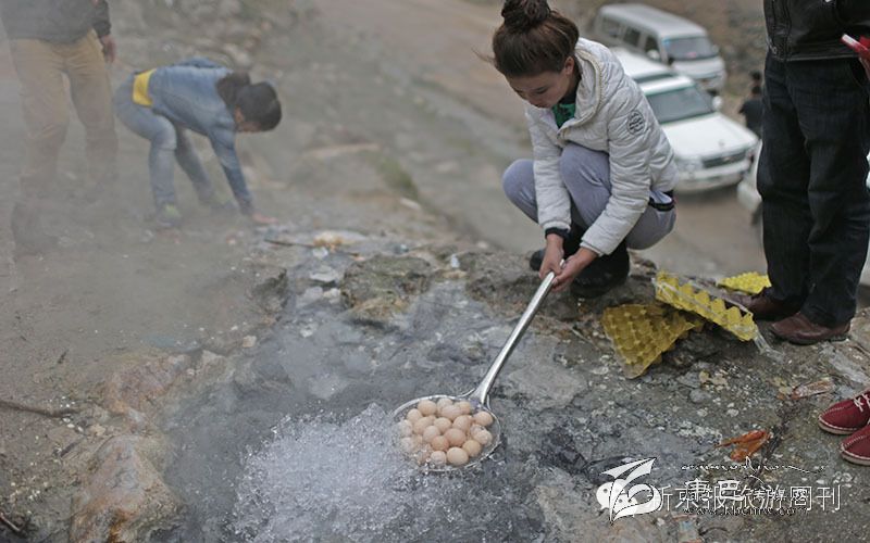 這里的溫泉很有趣,在石頭里能傳來水燒開后的聲響,而在露天的溫泉眼,水花噴涌,溫泉的溫度很高,據(jù)說有90度,我們拿了好多雞蛋,用漏勺盛著,放進(jìn)去煮,幾分鐘后,就熟了。蛋黃完全凝固了,可見溫度是很高的。