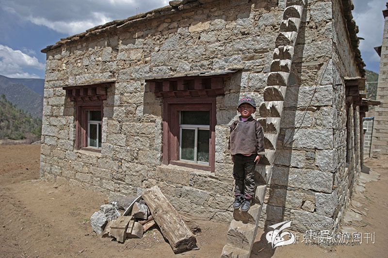 阿西村,一個(gè)小男孩在藏族地區(qū)特有的登高梯上擺姿勢照相。(攝影 陳杰)