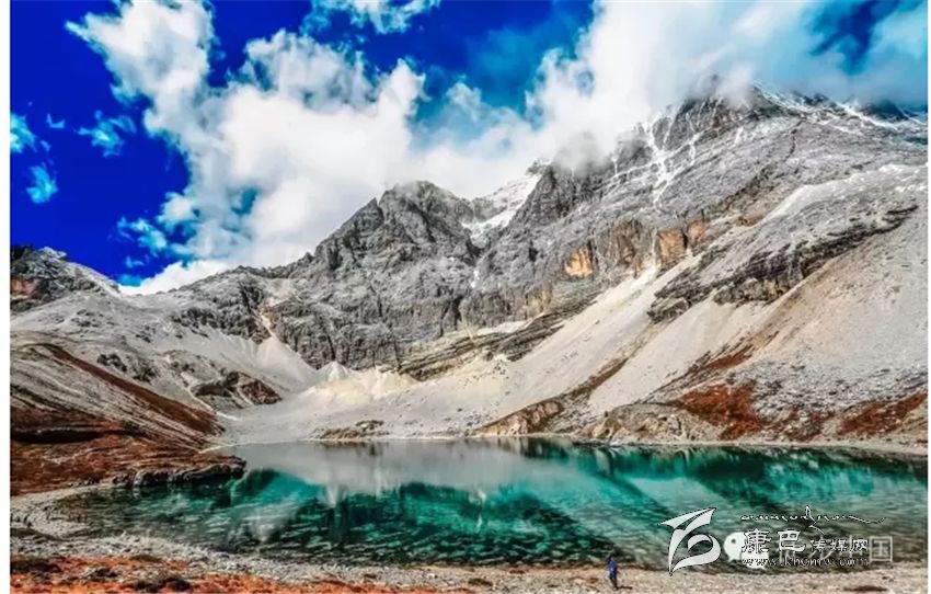 三神山中間的牛奶海,美麗的高原堰塞湖,面積0.5公頃,海拔4500米,四周雪山環(huán)繞,湖水清瑩碧藍,山上成瀑,以其玲瓏秀雅水色翠藍而著名,牛奶海上方有大片的冰川。傳說每年春暖花開之時,湖水會像牛奶一樣潔白如瓊漿,并因此得名牛奶海。