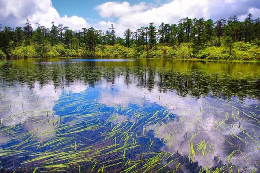 繼續(xù)前行,下一站既是木格措。木格措漢名:野人海,水源來自于身后女媧雪山的積雪融水,水質清冽,能見度極高,湖四周群山環(huán)抱,紅海、黑海、白海等幾十個小海子圍繞在周圍,如眾星拱月般。木格措風光秀美,“臥虎觀月”、“雙霧墜?!钡染坝^最為獨特。