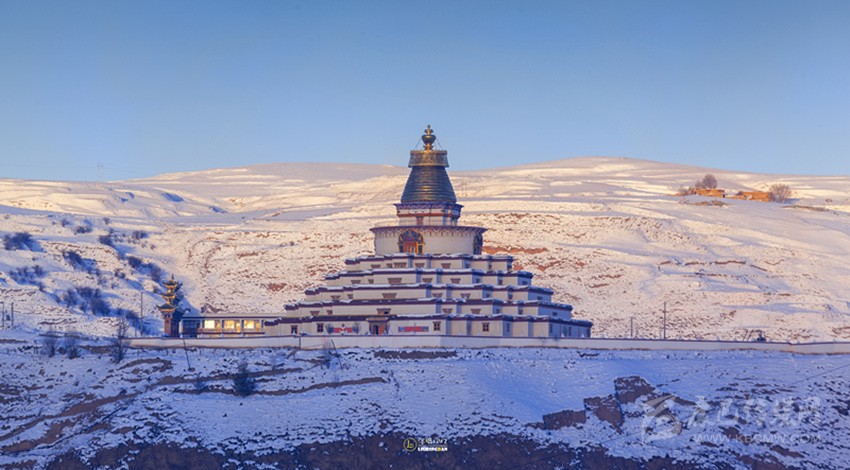 沿著甘孜縣城門向東南一望,一座37米高的大寶塔便呈現(xiàn)在你的眼前,寶塔其底三層寶座均北京天壇祈年殿座底比列大小而建。雄偉壯觀。