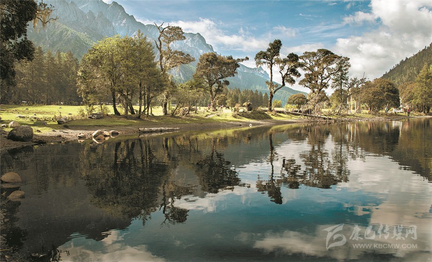 “江”與“湖”,靜臥于原始森林與草甸花海的之間,河溪清澈,湖水湛藍,真如秘密花園,人間仙境。湖畔最美的是盤根錯節(jié)的老柏樹,枝條彎曲如蒼龍,或立于湖畔,或臥于湖中,滿湖樹影、花影隨風搖曳。