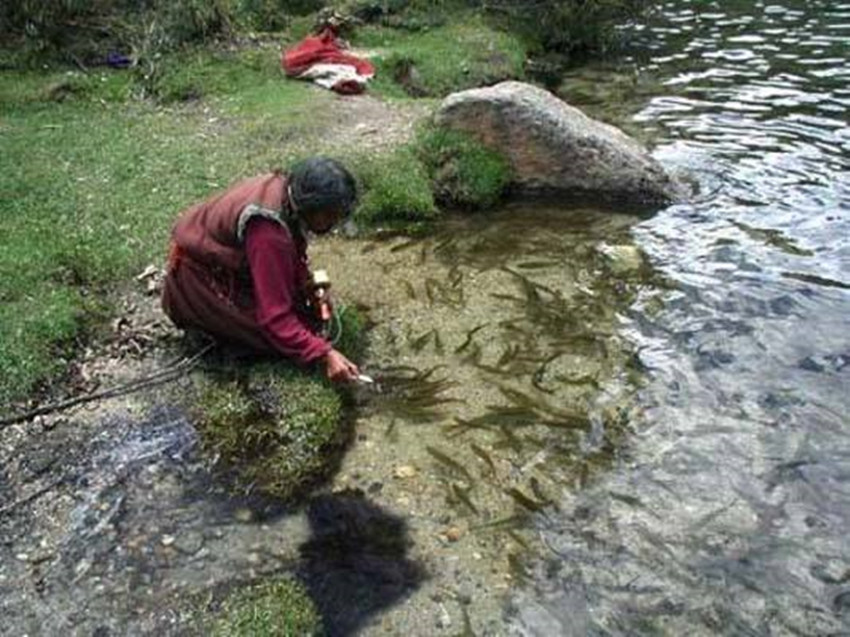 在湖邊的一塊平地上,有座被林莽掩映的廟宇,廟宇粉墻黛瓦,森嚴(yán)的大門銅環(huán)锃亮。棲息在原始森林中的藏馬雞與盤羊,跟寺院的喇嘛和尼姑建立了深厚的友情,相處得非常融洽。每年11月至來年5月,高山被茫茫大雪所覆蓋,大地披上了銀裝,這時候成群的動物到低處覓食,寺院利用這個機(jī)會,派人定時定點撒鹽巴和食物予以喂養(yǎng),漸漸使野生的動物們不再怕穿紅色袈裟的人,到后來居然無所顧忌地進(jìn)入寺院覓食。