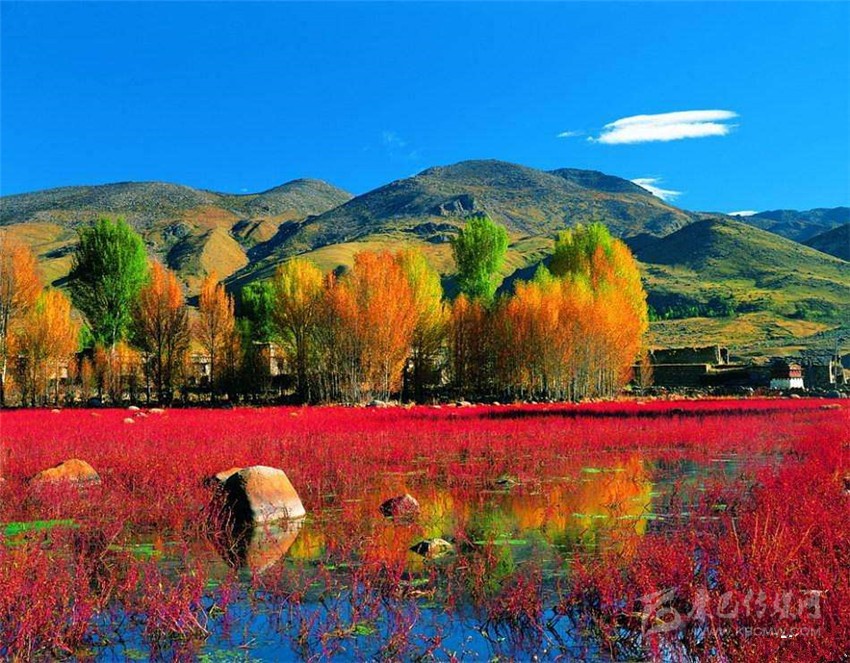 10月的紅草灘一片通紅,好像水面上在燃燒一樣,沒有草的水面將藍(lán)天白云倒映其中,背景又是一排排金黃色的楊樹林,結(jié)合在一起就構(gòu)成了這里如夢(mèng)般五彩斑斕的世界。