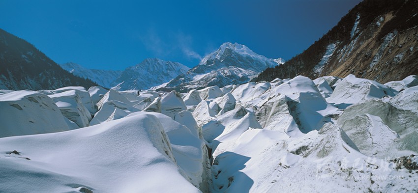 貢嘎山是我國現(xiàn)代海洋性冰川最發(fā)達(dá)的地區(qū),有數(shù)百條冰川。面積達(dá)300余平方公里。其中海螺溝一號冰川長14.7公里,面積16平方公里,是世界上同緯度海拔最低、最大的現(xiàn)代冰川,冰川、森林、溫泉共生,普通游客也可以輕松登臨進(jìn)行游覽。冰川上形成的冰面湖、冰塔、冰橋、冰洞、冰裂縫、冰宮、冰城門等千姿百態(tài),晶瑩璀璨。尤其是大冰瀑布的寬度和高度均超過了1000米,由無數(shù)巨大而光芒四射的冰塊組成,仿佛是從藍(lán)天直瀉而下的一道銀河,終日冰崩不斷。