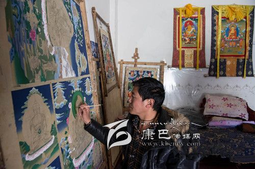 爐霍是一代唐卡宗師郎卡杰(約公元1610年生)的故鄉(xiāng),歷代傳承弟子風(fēng)格一脈相承,形成郎卡杰唐卡繪畫流派。該派作品的層次感,從花草樹木的枝葉前后層次,到山水房屋、飛禽走獸、人物器具的遠(yuǎn)近距離和明暗關(guān)系,都彰顯了三維立體的空間效果,繪畫中除了對(duì)主圖的精湛表現(xiàn),對(duì)局部結(jié)構(gòu)的精確處理和頻現(xiàn)微型畫像的神奇描繪,更是完美結(jié)合。郎卡杰本人作品《佛本身轉(zhuǎn)》、《二圣六莊嚴(yán)》等作品堪稱一絕。2008年,文化部授予爐霍“中國(guó)民間藝術(shù)之鄉(xiāng)——唐卡之鄉(xiāng)”。