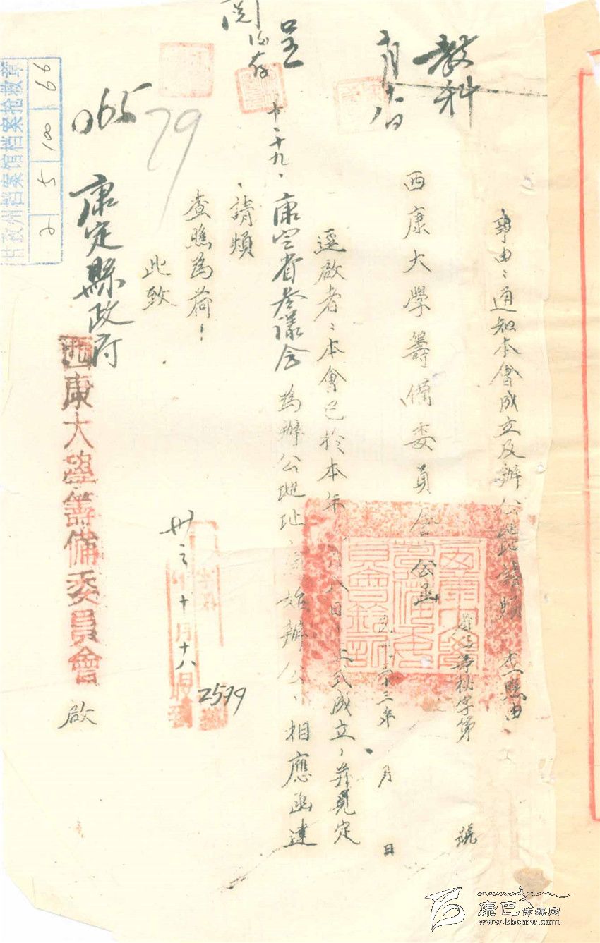 根據這份資料上“教科:10月18日”和“呈閱后存:10月19日”等字樣推算,這個“西康大學籌委會”可能是在10月8日成立的,這份函件是送往康定縣政府,告知“籌委會”辦公地點的一般函件。