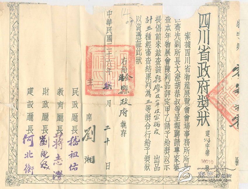 在公元1937年期間,當時還是由四川省的實力軍閥劉湘在擔任四川省的主席,當時四川省的民政廳、教育廳、財政廳、建設(shè)廳是承辦者,所以獎狀就是以這些當年的頭面人物所在機構(gòu)和他們的個人簽名發(fā)出。