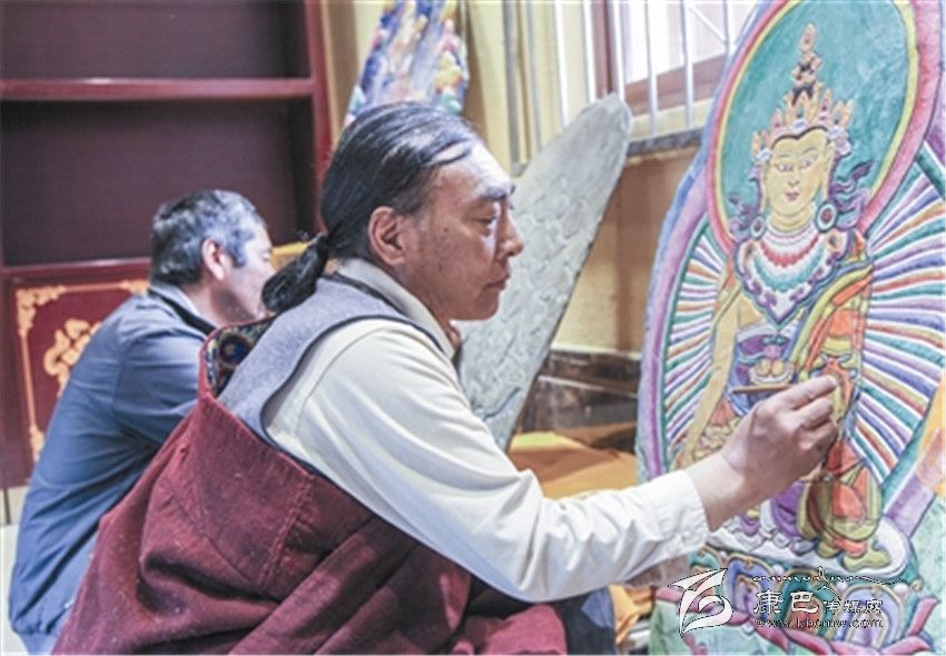 從子承父業(yè)再到吸眾家之長,自離開故鄉(xiāng)的那天起,巴德的視野開始變得開闊起來。1979年到省藏校學(xué)習(xí)藏文和美術(shù),并開始涉獵泥塑技藝,隨后又向德格民間藝人扎西澤郎學(xué)習(xí)彩繪石刻,然后又到西藏、甘肅等地學(xué)習(xí)繪畫、石刻技藝。巴德說,自己之所以有今天的藝術(shù)造詣,是因?yàn)橛幸慌麕熤更c(diǎn),是因?yàn)樽约旱牟粩嗵剿骱烷L期堅(jiān)守。讓他欣慰的是,自己的三個兒子都在學(xué)習(xí)石刻和繪畫,親戚朋友中的十多個孩子也成了他的入門弟子。