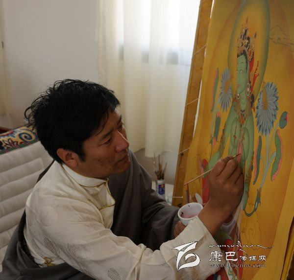 “如此工藝精細(xì)、筆法工整的繪制過程,必然注定價(jià)值的與眾不同。”記者話音未落,他便迫不及待地加以了例證:“比如,要繪制一幅長1.25米、寬1米的‘多派唐卡’,需要有近百個(gè)佛像,最小的佛像頭部只有指甲蓋大小,筆觸要求非常細(xì)膩,哪怕每天都堅(jiān)持畫十幾個(gè)小時(shí),至少也要一年多時(shí)間來才能完成。由于題材從宗教轉(zhuǎn)向世俗、審美從傳統(tǒng)走向現(xiàn)代、技法從圖像制作走向藝術(shù)創(chuàng)造,唐卡作為‘藏密文化’的概念正逐漸被世人所知,并成為唐卡藝術(shù)品市場上的寵兒。2012年3月18日,我和一級唐卡畫師丁嘎創(chuàng)作的《五度母像》長幅唐卡以168萬元的高價(jià)被收藏者購買,創(chuàng)下了‘多派唐卡’最高售價(jià)紀(jì)錄,‘多派唐卡’也因此成了公眾與輿論關(guān)注的熱點(diǎn)和焦點(diǎn)。”