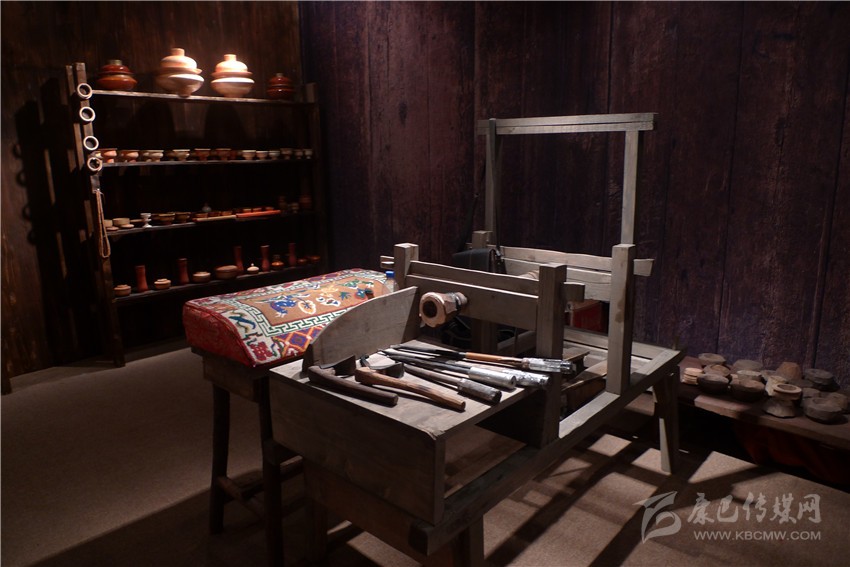 一處古色古香的展柜上,各種藏式木制茶具、碗散發(fā)著古老質(zhì)樸的氣息,天然的花紋自然流暢,色澤婉轉(zhuǎn)溫厚。距離展柜較近的地方,兩架可手工操作的藏式木制機(jī)器有規(guī)律地運(yùn)轉(zhuǎn)著,來自得榮的格絨次仁父子正在機(jī)器上演示藏式木碗的制作過程。