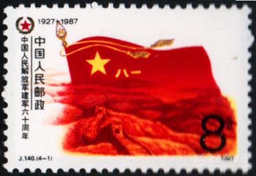 1977年8月1日原郵電部發(fā)行的《中國人民解放軍建軍50周年》紀念郵票,其中第4枚“雄師過大江”,圖案中一名沖在渡江隊伍前面的戰(zhàn)士高舉一面“八一”軍旗。1987年8月1日原郵電部發(fā)行的《中國人民解放軍建軍60周年》紀念郵票一套4枚。其中第1枚“軍魂”,郵票上一面鮮紅的“八一”軍旗迎風飄揚,旗下是蜿蜒的萬里長城,代表了中國人民解放軍是保衛(wèi)祖國和人民的“鋼鐵長城”。1995年8月1日,原郵電部試發(fā)行一套“義務兵專用”郵票一套1枚,票名為“神圣的使命”,圖案以紅光四射的“八一”軍旗為背景,以現(xiàn)代化的飛機、坦克、火箭和象征和平的白鴿為襯托,畫面是威武的陸海空三軍,顯示我軍鋼鐵長城般攻無不克、戰(zhàn)無不勝的精神風貌。