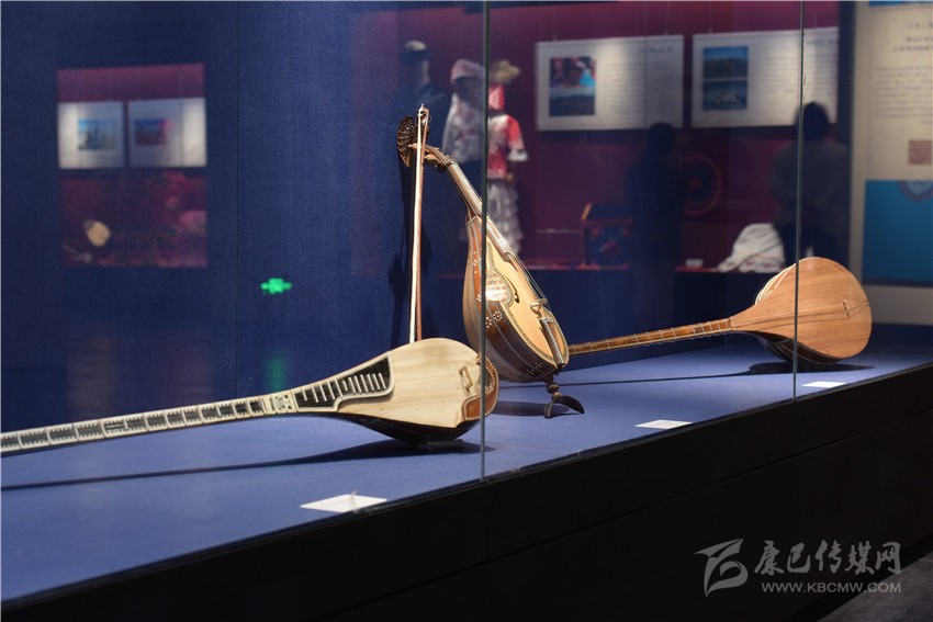 走進(jìn)凹字型的展廳內(nèi),可見蒙古族的馬頭琴、哈薩克族的冬不拉、維吾爾族的手鼓朵帕、回族的掛毯湯壺等。展覽以實物和圖片相結(jié)合的形式,從“草原驕子”、“刀郎木卡姆”、“駿馬與詩歌”、“花兒與少年”四部分展現(xiàn)博爾塔拉草原上各民族獨具魅力的生產(chǎn)方式、衣食住行、傳統(tǒng)技藝、民族服飾、文化娛樂等民俗風(fēng)情,為觀眾呈現(xiàn)了博州異彩紛呈的地域文化。