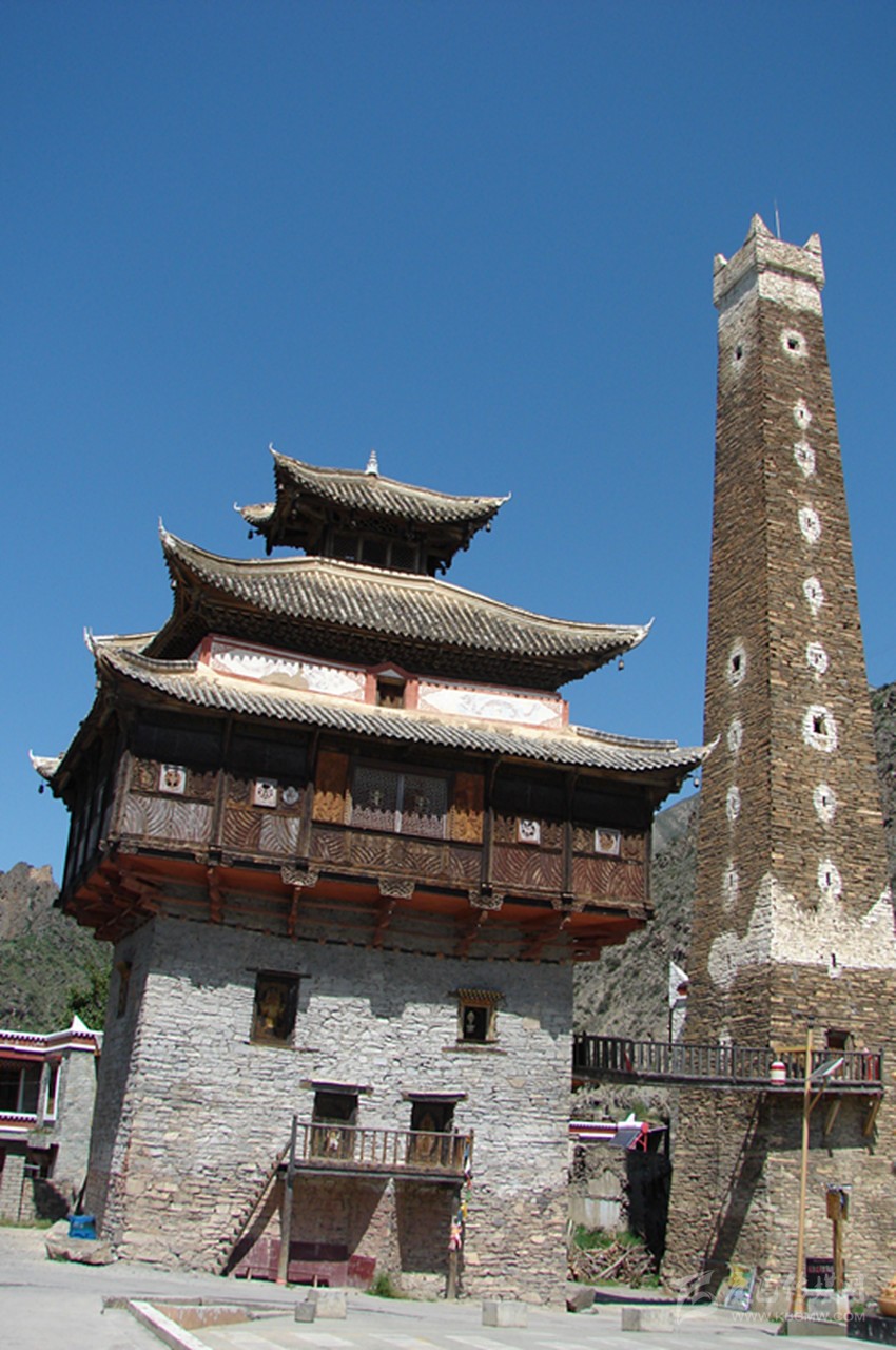 站在廣場中央仰望,碉樓有十五層高,約有二十余米,其外墻為片石壘砌,并附建有經(jīng)堂碉及過街樓,防御性極強。整座碉樓在修建中,層層收分,從墻面往上看,傾斜面在八十度左右。到達碉樓頂,面積只有四平米左右,在每一層樓里,都有外窄內(nèi)寬的窗戶,是典型的堡壘式射擊孔。在通往碉樓頂?shù)拿恳粚臃块g內(nèi),都有一根獨木梯連接著。第一層為石材壘筑的實心體,這種建筑方式為碉樓下大上小、重心向內(nèi)、穩(wěn)定性強的特點奠定了牢固的基礎。碉樓內(nèi),水源路網(wǎng)環(huán)環(huán)相通,倉儲空間很大。第二層為放置日常用品的地方,房門開在第三層,連接地面的依然是一根獨木梯,若遇敵人來犯時,人們便從獨木梯上攀援而上,再將獨木梯抽取。這樣,一座碉樓就固若金湯,只需從射擊孔中射出箭,或者從碉樓頂?shù)乃慕侨酉乱粔K塊巨石,不管敵人是如何的孔武有力,還是擁有如何的謀略,在碉樓面前都會束手無策,最后只能選取最原始的進攻方法——圍而不攻。坐待碉樓里的人彈盡糧絕之日,不過,人們在修建碉樓時,已充分的考慮了這些因素,在每一層樓里都儲備了足夠幾年之需的食物和水,這樣,往往是圍攻的人耐不住性子,最后只好悻悻然退卻。