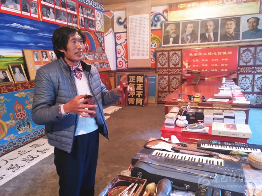 到了九龍,記者幾次打算采訪呷爾鎮(zhèn)原文化站站長王長生。王長生,人稱王老表。65歲的王長生本該退休在家安享晚年,然而,作為九龍乃至甘孜州的文化名人以及他在開展群眾工作方面的建樹,退休后,他依舊是個(gè)大忙人,黨的十九大勝利召開后,作為省級(jí)優(yōu)秀宣講員,為了搞好宣講,他潛心備課,黨的十九大精神宣講全面鋪開后,他與宣講團(tuán)成員一道奔赴瀘定、丹巴、雅江、九龍等縣農(nóng)牧區(qū)宣講。12月12日,他忙里偷閑,在美觀整潔的家里接受了記者的采訪,多才多藝的王長生向記者展示了他高超的才藝。