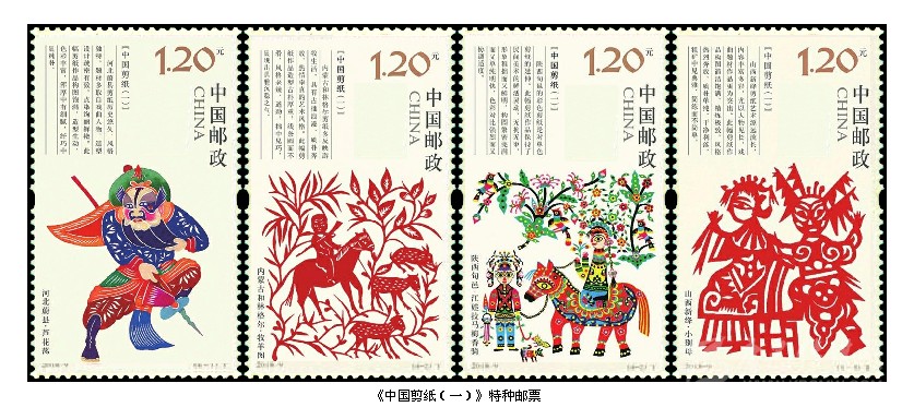 2018年1月24日,中國郵政發(fā)行《中國剪紙(第一組)》特種郵票,全套4枚。這是中國郵政繼1959年1月1日發(fā)行的《剪紙》特種郵票59年后重新發(fā)行的《中國剪紙》系列郵票。全系列郵票計劃發(fā)行4組,每組4枚。這次發(fā)行的第一組4枚郵票入選內(nèi)容分別是被列入第一批國家級非物質(zhì)文化遺產(chǎn)名錄的北方四處剪紙傳承人的作品:第一枚“河北蔚縣·蘆花蕩”,河北蔚縣剪紙歷史悠久,風格獨特,題材多取自于人物,造型設(shè)計疏密有致,點染絢麗鮮艷。此幅作品作者王老賞(1890-1951),河北省蔚縣南張莊村人;第二枚“內(nèi)蒙和林格爾·牧羊圖”,內(nèi)蒙古和林格爾剪紙多反映游牧生活,具有古拙浪漫、質(zhì)樸奔放、熱情率真的藝術(shù)風格。此幅作品作者張花女 (1903-2004),和林格爾縣董家營鄉(xiāng)曹老八夭村人;第三枚“陜西旬邑·江娃拉馬梅香騎”,陜西旬邑的彩色剪紙具有民間美術(shù)的鮮活靈動,無拘無束,形象稚拙而又鮮明,構(gòu)圖緊密完滿而又單純明快,色彩對比強烈而又協(xié)調(diào)適度。此幅作品作者庫淑蘭(1920-2004),陜西咸陽市旬邑縣張洪鎮(zhèn)赤道鄉(xiāng)富村人;第四枚“山西新絳·小別母”,山西新絳剪紙藝術(shù)源遠流長,內(nèi)容豐富多彩,尤以人物見長,戲曲題材作品更為突出,構(gòu)圖簡潔飽滿、精煉極致,粗獷中見典雅,簡煉而不簡單。此幅作品作者蘇蘭花(1906-1995),山西運城市新絳縣澤掌鎮(zhèn)北蘇村人。