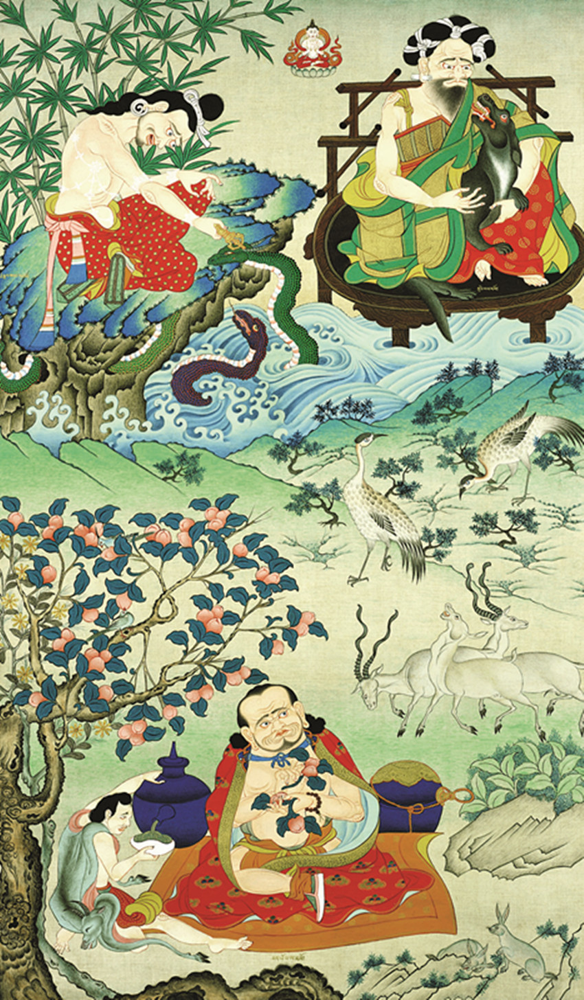而從外部來看,元朝開始,西藏正式納入中國版圖,中原漢地的繪畫和西藏唐卡也大大增加了融匯交流的可能性。明朝延續(xù)了元朝對西藏的權(quán)力控制。政治關(guān)系日益穩(wěn)固,漢藏關(guān)系愈發(fā)融洽,文化交流也日漸繁盛。隨著漢地羅漢畫和青綠山水畫的技法大量進(jìn)入西藏。于是唐卡繪畫從十五世紀(jì)開始逐漸弱化印度、尼泊爾的影響,主動學(xué)習(xí)、借鑒漢地的繪畫藝術(shù)。這是一個巨大的美學(xué)沖擊,它直接助攻了西藏唐卡本土化的進(jìn)程。