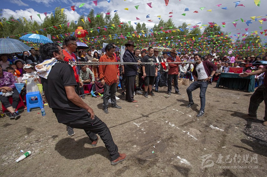 除以上活動,滾桶接力、俯撐馬鞍吃葡萄、穿藏裝揉糌粑、套牛角等趣味比賽無不展示民族體育的獨特風格?!斑@種拔河還是第一次見,很有意思?!逼渲校案裢獭北荣悾ò褞ё犹自诓弊由习魏樱┥畹糜^眾喜愛。