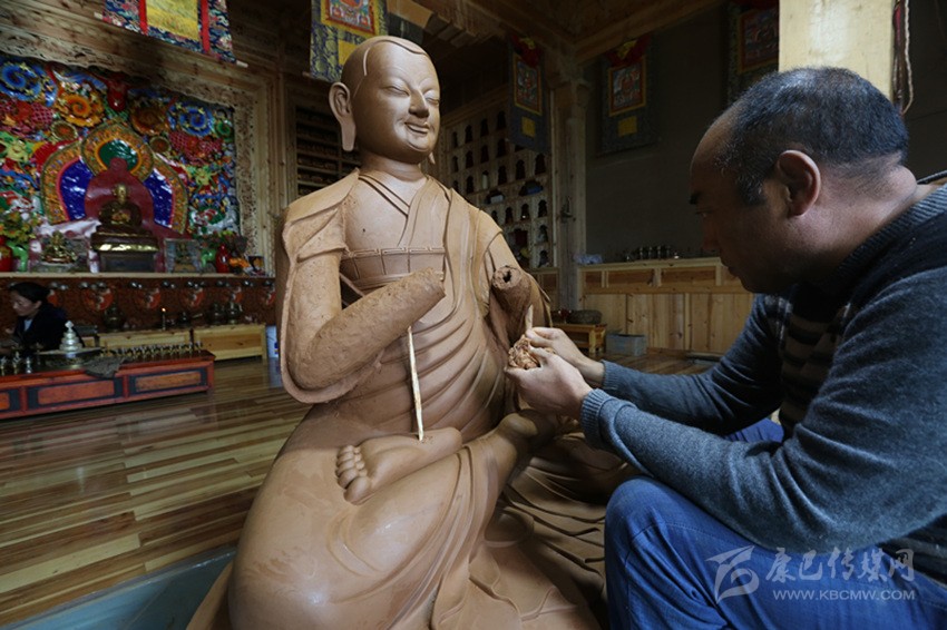 見(jiàn)到克村時(shí),他正在鄰村一農(nóng)戶的經(jīng)堂里制作佛像,盤坐在蓮花寶座上的宗喀巴大師和兩個(gè)弟子身披袈裟手持經(jīng)書的泥塑作品神形兼?zhèn)洌@是克村和徒弟多登近半個(gè)月的心血??舜遄诓?jí)|上,心無(wú)旁騖神情專注地,用木制工具對(duì)作品進(jìn)行打磨,旁邊擺放著一盆清水和一筐自制的工具。
