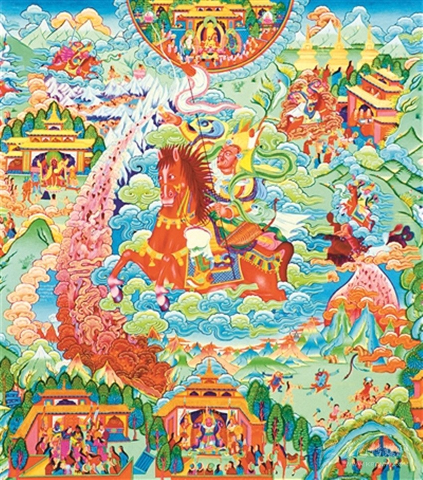 “中間世上各種紛爭(zhēng)”,講的是格薩爾從誕生到升天的全過程,這一部分,構(gòu)成了格薩爾的全部英雄業(yè)績,也是史詩的主體部分。