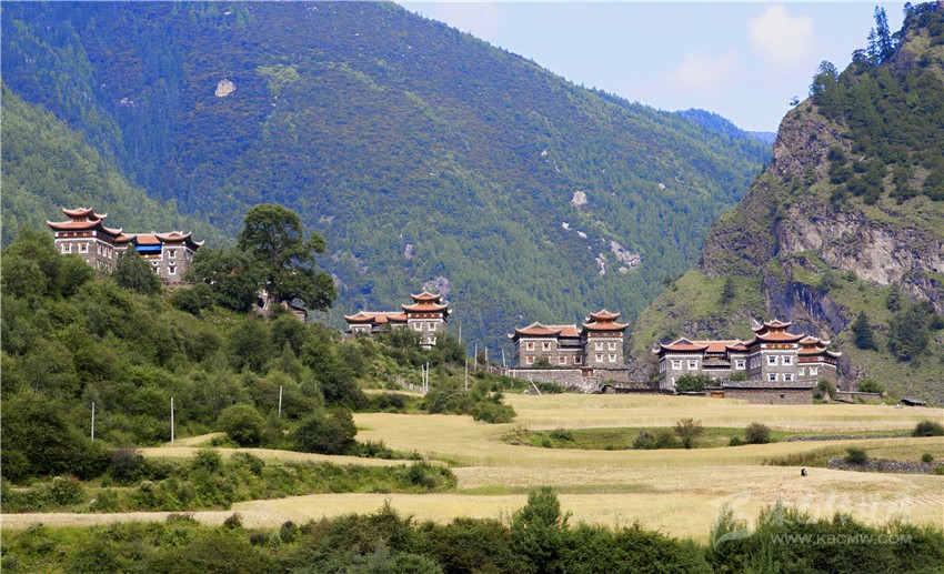 藏寨從大金河谷層層疊疊向上攀緣,在相對(duì)高差近千米的山坡上,一幢幢藏式樓房或星羅棋布,或稠密集中,錯(cuò)落有致。不時(shí)炊煙裊裊、云霧繚繞,詩(shī)情畫(huà)意。