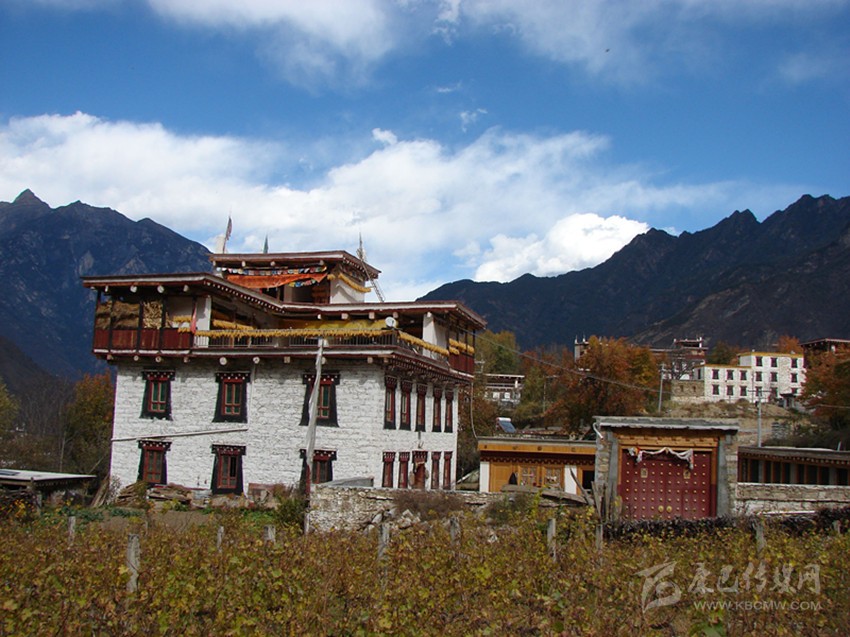 當(dāng)翻過一處斷崖,眼前豁然開朗。一大片平整的田地出現(xiàn)在我們的面前。田地里,一棟棟白色的藏房或鶴立雞群,或三五聚集,看似毫無規(guī)律,其實(shí)從整個(gè)房屋大門的朝向可以看出,在房基的選擇時(shí),對(duì)陽光的接納面、風(fēng)水等都作了充分的考慮。