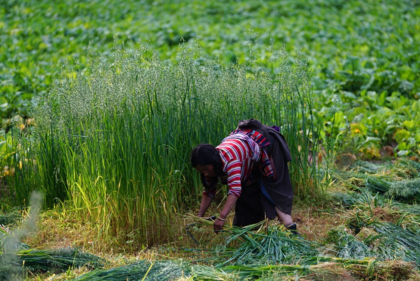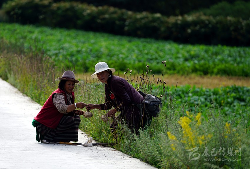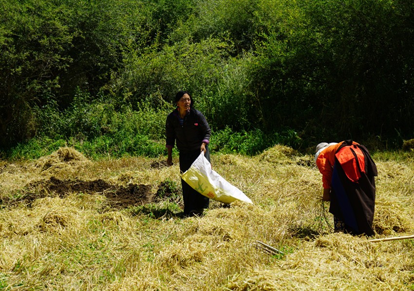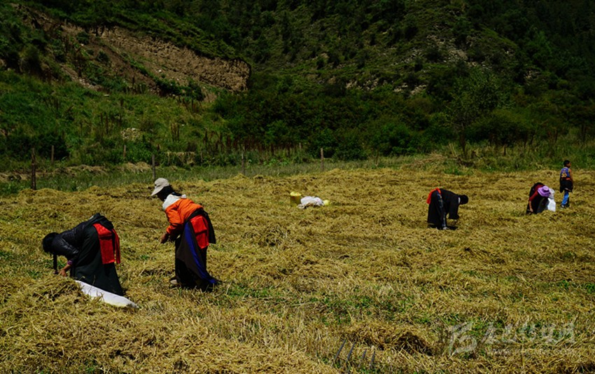 開(kāi)始收割了,從坡地到川地,到處是收割機(jī)的聲音。青稞是車(chē)巴溝的主要作物,因?yàn)橐デ囡妫贼佤?。村里人忙得團(tuán)團(tuán)轉(zhuǎn),收割機(jī)開(kāi)過(guò)去,大家就跟在后面撿穗子。如此往復(fù),一直要到糧食拉到家里。
