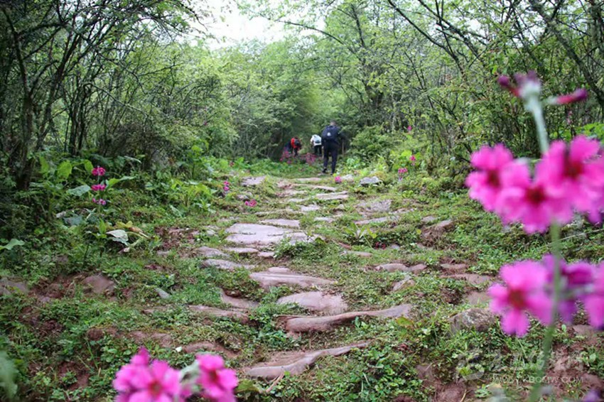 古道崎嶇,路險(xiǎn)泥滑,穿溪越澗,我們相互鼓勵(lì),相互幫助艱難下行。半山的坡地林間,三五株一束,七八株一叢,殷紅的報(bào)春花滿山遍野,染紅延綿起伏的山坡。