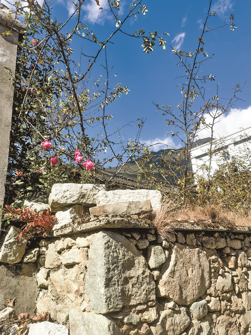 在小飯館里簡單吃了一頓午餐,可惜沒有嵐安豆花,臘肉倒是如大家說的那樣香。吃完飯?jiān)诖遄永锫o目的的轉(zhuǎn)悠,石頭砌的矮墻將每家每戶的房屋圍成院子,墻頭上的草已經(jīng)泛黃枯萎,偶爾有幾枝玫紅色的月季從墻頭伸出來,給石墻點(diǎn)綴了一些色彩和生機(jī)。石墻與石墻之間,是串聯(lián)起每一戶人家的村間小道,經(jīng)過幾戶農(nóng)家,腳下硬化的路面斷了,往前延伸的是窄小的泥路,路兩旁有綠油油的菜地,有收割完的玉米地,有一排排的蘋果樹……往更遠(yuǎn)的地方看去,田地盡頭的山坡上是紅軍紀(jì)念碑,原來這里可以通往紀(jì)念碑,不過目測距離有點(diǎn)遠(yuǎn),收住腳步往回走,沿著村道朝另外一個(gè)方向走走看。前面是散落在小山坡上的幾戶人家,比起之前被石墻圍起看不見樣貌的農(nóng)家,山坡上的這些房子錯(cuò)落有致,清楚的看得見院子的全貌,房屋大多是一層的由石墻瓦頂構(gòu)筑的,每一戶人家都飄揚(yáng)著鮮艷的紅旗。