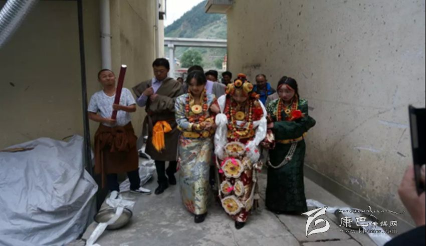 接親。除表現(xiàn)主人的熱情、好客、大方外,還要講究氣派,顯富有、高檔次、高規(guī)格。以娶親為例,舉行婚禮的當(dāng)天,男方要組織數(shù)十匹馬隊或高檔汽車接親,披金掛銀,蔟新華麗。接親的馬隊從新娘家出發(fā)后,男方要在家或路過人家必經(jīng)之地設(shè)置吉祥物,如盛滿一桶水或鋪一床藏毯、或隨身衣物鋪在地上,當(dāng)接送新娘的馬隊路過時,接親的人要給吉祥物獻(xiàn)哈達(dá)和拋撒銀錢、紙錢和糖果等以示新娘路遇彩頭、沖喜,表示吉祥如意。到男方家后新娘被扶下馬或扶下車,高僧大德頌吉祥詞后,圍繞所放佛像或吉祥八寶圖及裝滿水或牛奶的銅鍋順轉(zhuǎn)三圈后,踩著從大門口鋪至經(jīng)堂的藏毯進(jìn)屋,進(jìn)入客廳之前新娘只身先進(jìn)廚房,點燃灶里準(zhǔn)備好的柏香紅木或枝葉進(jìn)行熏煙,據(jù)藏醫(yī)考證熏香煙對身心健康有益,也可表示從即日起新娘便是男家的主婦了。