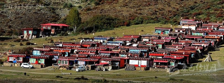 藏式房多平頂,可以說是環(huán)境的產(chǎn)物。高原干旱少雨,無須飛檐高頂,冬有積雪,便于打掃;最重要的是風(fēng)沙大而頻繁,高屋難耐勁風(fēng)。此外,平頂民房還有一個(gè)精神功能就是作為信仰的場所。房頂供奉有神靈的祭壇,有煨桑的香爐,更有家家必插的五色經(jīng)幡,有的房頂平臺(tái)的圖符裝飾極為精美,把最古老的建筑樣式和最現(xiàn)代的建筑格調(diào)融為一體。另一個(gè)共同特點(diǎn)便是,一般講究一些的農(nóng)村都把房子的夯土外壁刷成暗含深意的純白。這自然是典型的藏式院落了。而不太講究的半農(nóng)半牧區(qū)則保持原色。白色房屋上部突出棕色材料的房檐,或漆成棕紅的裝飾帶,既勾勒出輪廓,又平添了幾多美觀。白色建筑在藏語中有個(gè)非常詩意的名字,叫“點(diǎn)點(diǎn)繁星”。
