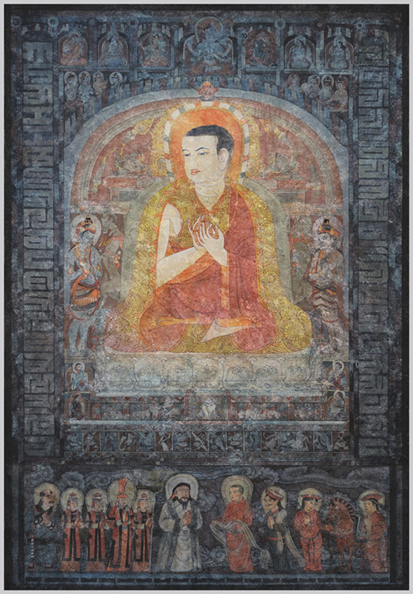 工筆畫作品《大元帝師八思巴》是我在2012年創(chuàng)作的,該作品表現(xiàn)了歷史上西藏高僧八思巴的英偉形象和他的傳奇經(jīng)歷。作品畫心寬約105厘米,高約152厘米,八尺云龍紙裁小使用。材料包括:礦物顏料、植物顏料、水彩顏料和丙烯顏料等。賦色方面使用礦物顏料在生紙上皴擦出滄桑的斑駁美感。用深淺冷暖來(lái)讓八思巴坐像和“六盤山相聚”在畫面上顯現(xiàn)出來(lái),而其他內(nèi)容則逐漸隱藏于漫漶的背景里面。畫面正中身著華美僧衣者就是薩迦五祖之八思巴,他有著昆氏家族的尊貴容貌、有著薩迦法王教主的莊嚴(yán)神態(tài);他雙手結(jié)轉(zhuǎn)法輪印于胸前,跏趺坐于金剛法座之上,法臺(tái)正中的海螺正是薩迦派圣物。昆氏家族世代以“三怙主”(文殊菩薩、觀音菩薩和金剛手菩薩)化身而傳承教法至今,故教派寺院圍墻涂有象征“三怙主”的紅、白、藍(lán)三色,故又稱“花教”;所以在畫面頂上主尊的位置分別是觀音、文殊、金剛手三位菩薩。