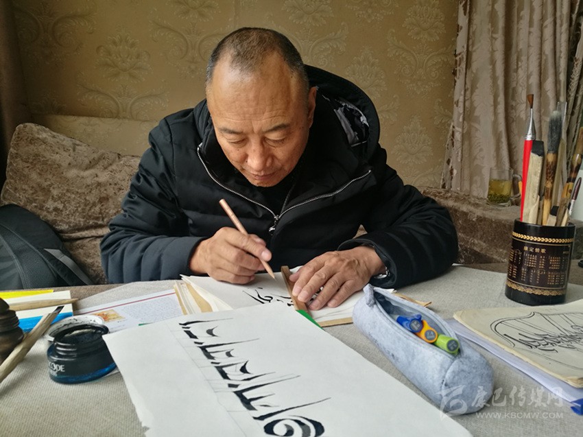 一揮而就的瞬間,“扎西德勒”的藏文立體書法落在宣紙上,等候墨跡干掉的片刻,仁真丹松拿起《藏文文法綱要》,津津有味地讀了起來。