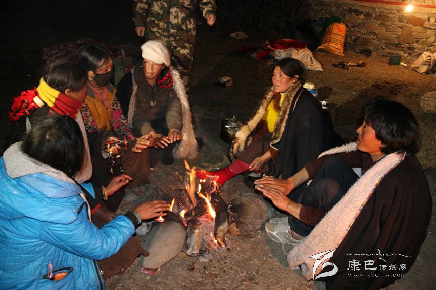 受災(zāi)群眾在房屋外烤火取暖。
