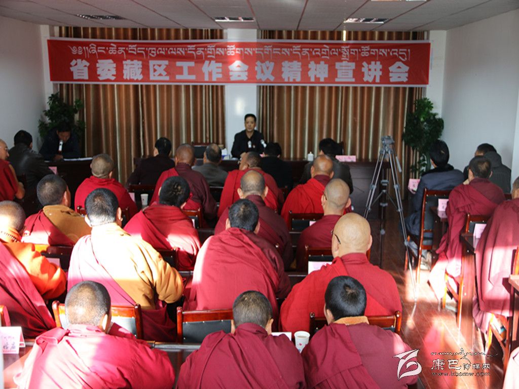 劉成鳴在宣講中說(shuō),近年來(lái),在座的高僧大德致力于傳承弘揚(yáng)正法、踐行佛陀崇高教義,致力于引導(dǎo)宗教與社會(huì)主義社會(huì)相適應(yīng),致力于團(tuán)結(jié)引領(lǐng)廣大僧尼與黨委政府同心同向、同心同行,為地方發(fā)展、穩(wěn)定、民生等各項(xiàng)事業(yè)作出了很大貢獻(xiàn)。希望大家深刻理解省委藏區(qū)工作會(huì)議特別是省委王東明書(shū)記的重要講話精神,當(dāng)好黨委政府聯(lián)系服務(wù)廣大寺廟寺廟僧尼的橋梁,帶頭做愛(ài)國(guó)愛(ài)教的表率,帶頭做知法守法的表率,帶頭做持戒精修的表率,帶頭做配合黨委政府工作的表率,共同實(shí)現(xiàn)寺廟建設(shè)好、僧人生活好、藏傳佛教發(fā)揚(yáng)傳承好、管理服務(wù)好、和諧穩(wěn)定好的“五好”目標(biāo),達(dá)到黨委政府、僧眾和信眾三個(gè)滿意。