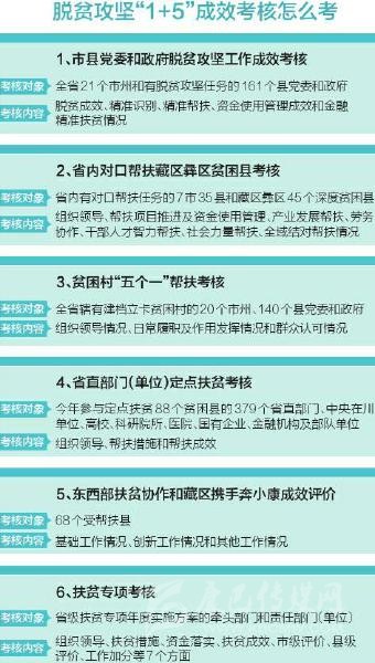 如何考?省扶貧開發(fā)局相關(guān)負(fù)責(zé)人介紹,具體而言,就是將黨委和政府脫貧攻堅(jiān)工作成效考核、省直部門(單位)定點(diǎn)扶貧考核、扶貧專項(xiàng)考核、省內(nèi)對口幫扶藏區(qū)彝區(qū)貧困縣考核、貧困村“五個(gè)一”幫扶考核、東西部扶貧協(xié)作和藏區(qū)攜手奔小康成效評(píng)價(jià)統(tǒng)一整合為脫貧攻堅(jiān)成效考核,一支隊(duì)伍完成所有考核。