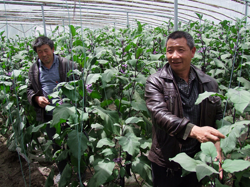 瀘定縣德威鄉(xiāng)磨子溝村委成員觀摩大棚蔬菜。