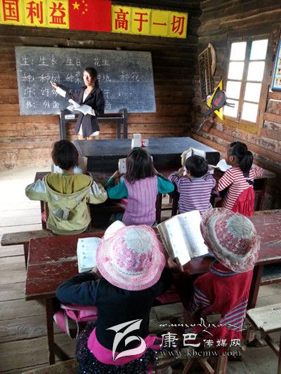 村小唯一的老師、90后藏族女孩鄧珠志瑪在黑板上寫下:生日、種樹、外面……字很大很方,“教室里沒有電燈,字寫小了怕孩子看不到。”兩排課桌,6個(gè)一年級學(xué)生坐在長板凳上,當(dāng)天有個(gè)孩子請假了,這是村小唯一的班,共7個(gè)孩子。“來,同學(xué)們和我一起念。”鄧珠志瑪朗讀起黑板上的詞語,孩子們的聲音很洪亮。