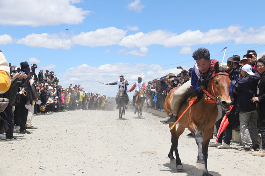 雪山潔白、青稞碧綠,雪白的貢嘎海棠搖曳在枝頭,目之所及,皆是風(fēng)景。騎手騎著(zhù)自己心愛(ài)的馬兒,一個(gè)個(gè)英姿颯爽、神采飛揚。隨著(zhù)發(fā)令員的口號響起,駿馬像離弦的箭一樣飛奔出去,騎手們全都鉚足了勁,勢必要在比賽中拔得頭籌。賽道上的駿馬你追我趕,賽道邊慕名前來(lái)的游客和周邊村民吶喊加油,跑出了甘孜兒女奮發(fā)向上、積極進(jìn)取的精神風(fēng)貌。