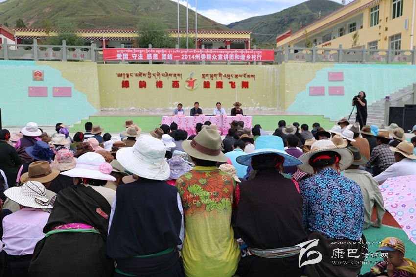 “2014州委群眾宣講團(tuán)和諧鄉(xiāng)村行”宣講團(tuán)9月11日下午來到道孚縣格西鄉(xiāng),在格西鄉(xiāng)中心校內(nèi),群眾們早早到來,盤腿坐在塑膠跑道上,認(rèn)真聽州民干校高級講師仁志降澤用藏文講述的一個(gè)又一個(gè)通俗易懂的小故事,感知“愛國 守法 感恩 團(tuán)結(jié)”八個(gè)字。他還結(jié)合具體實(shí)例講述法律、交通方面知識,大家聽得聚精會(huì)神,時(shí)而被降澤老師的小故事逗的捧腹大笑,時(shí)而陷入了深深的思考。