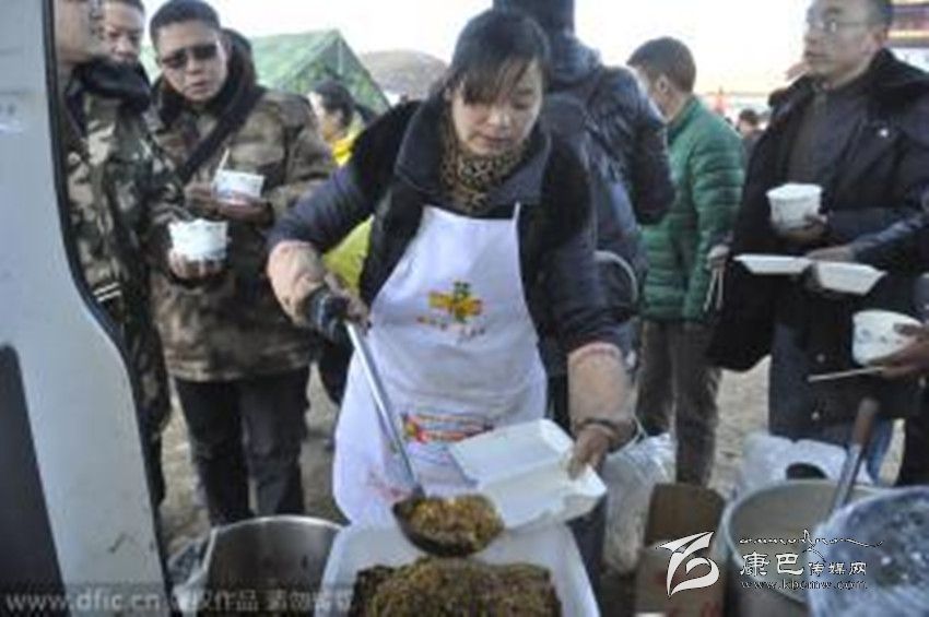 據(jù)了解,韓大哥是這家飯店的老板之一,他是仁壽縣人,幾年前和朋友來(lái)到新都橋開始經(jīng)營(yíng)飯店??刀?.3級(jí)地震發(fā)生時(shí),他人在成都。但看到災(zāi)情發(fā)生,韓大哥立即和飯店另外幾個(gè)合伙人決定到安置點(diǎn)免費(fèi)送盒飯,“我在當(dāng)?shù)刈隽?、7年生意,現(xiàn)在出了事情,就應(yīng)該伸手支援嘛!”據(jù)韓大哥介紹,此次地震發(fā)生后,新都橋80%左右的飯店都已經(jīng)關(guān)門,他們的飯店因?yàn)檫€有一些接待工作,仍在正常營(yíng)業(yè)。自11月23日晚上,他家的飯店就主動(dòng)為塔公鎮(zhèn)的安置點(diǎn)免費(fèi)派送盒飯,“包括中午和晚上兩頓,兩葷兩素一湯的配置。”因?yàn)樘?, 韓大哥來(lái)不及仔細(xì)統(tǒng)計(jì),他大概知道每天送出的盒飯?jiān)?200盒到1500盒之間,每天送出盒飯的成本在4、5千左右。但在他看來(lái),這些其實(shí)都算不上什么,“能為災(zāi)區(qū)出一份力,我們就很滿足了,我們打算一直送到抗震救災(zāi)工作結(jié)束,也就是直到災(zāi)民有條件自己做飯的時(shí)候。”“這邊天氣很冷,他們吃的一般是些面包、牛奶之類的干糧,我們就是想讓大家吃到熱飯、熱菜。”據(jù)韓大哥介紹,每天飯店都會(huì)派出3、4個(gè)人將盒飯運(yùn)送到安置點(diǎn),“只要有人需要我們都會(huì)分發(fā)盒飯,包括一些志愿者和武警官兵也吃我們的飯。