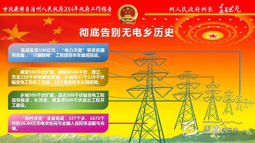 大力推進電力通信建設。投入20億元,加快實施“電力天路”、無電地區(qū)電力建設新增項目和農(nóng)網(wǎng)改造升級工程,切實緩解邊遠地區(qū)群眾缺電問題;完成長河壩電站500千伏等3個輸變電項目;統(tǒng)籌抓好表后入戶工程,確保群眾安全用電。投入6億元,新建通信光纜2360公里、基站1025個,解決國省干道、旅游景區(qū)景點信號盲區(qū);新增30個自然村通電話、545個行政村通寬帶,出口總帶寬達到82G。